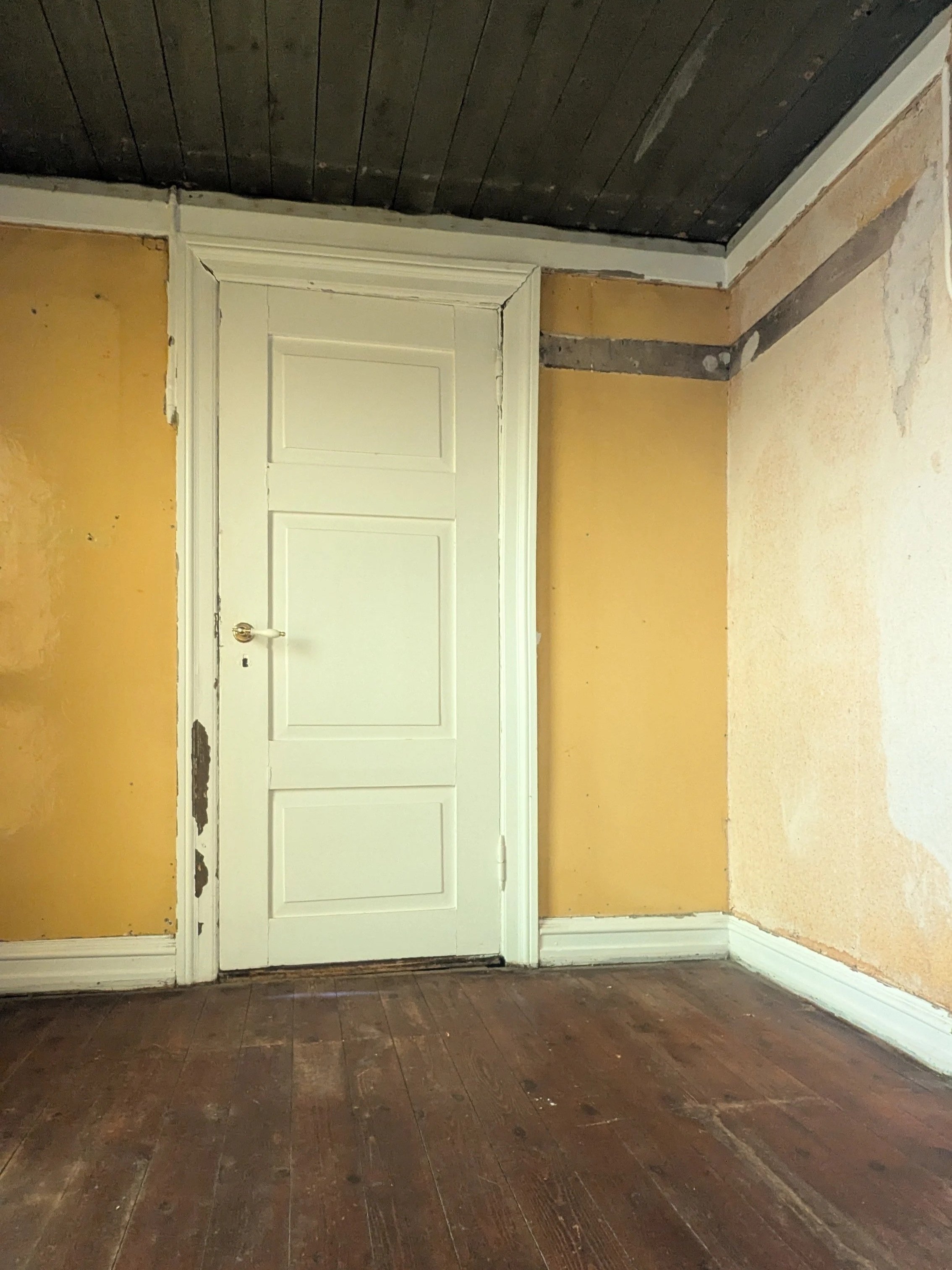 Meanwhile, inside the house… we decided to peel back the layers in the entryway—just to see what’s underneath. And what a surprise: we uncovered original wood floors, beautiful plank ceilings, and even a fragment of an old painted wall design. From what we can see so far, it looks like vines and leaves—delicate, faded, and full of story.